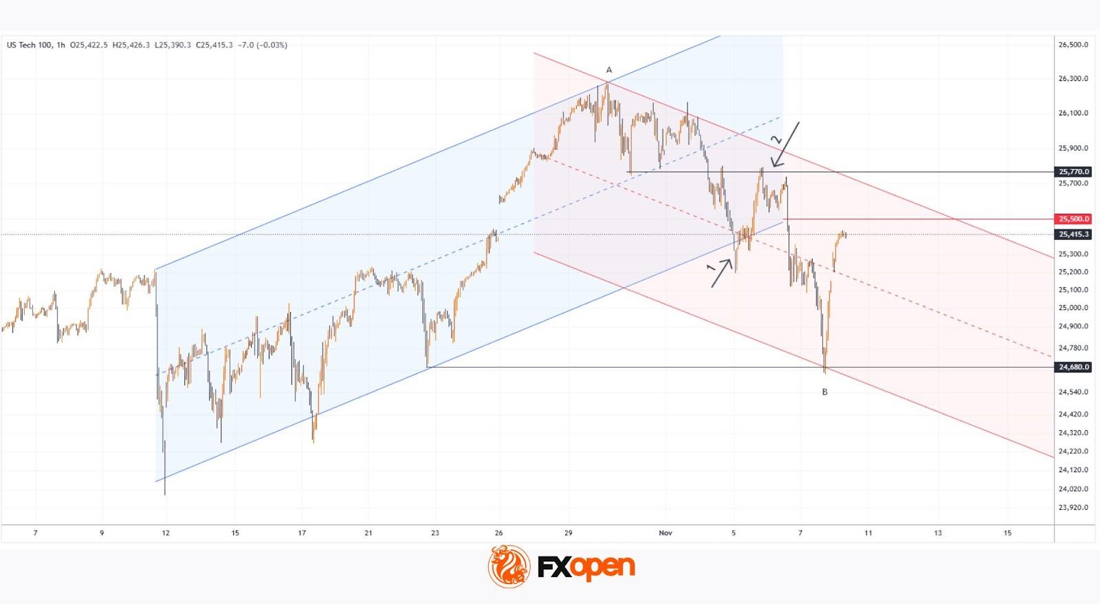 Анализируя часовой график индекса Nasdaq 100 (US Tech 100 mini на FXOpen) 4 ноября, мы: