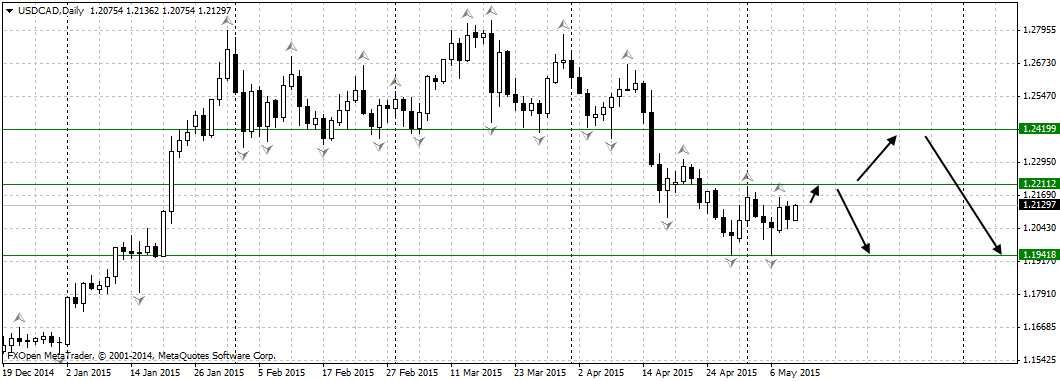Разворотная комбинация по нефти на дневном таймфрейме от 6 мая немного поубавила пыл покупателей канадского доллара. Неспособность цены в очередной раз уйти ниже 1.1940 отправила пару тестировать недавние поддержки на 1.20-1.21. Справится с поставленной перед «быками» задачей помогли новости по изменению занятости в стране за апрель. Показатель упал с -5,0К к -19,7К.