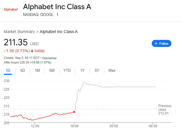 В конце августа мы писали, что цена акции Alphabet (GOOGL) поднялась на исторический максимум, закрывшись выше $210. Но сегодня цена, скорее всего, поднимется на новое, значительно более высокое значение. Ведь вчера на постмаркете она взлетела на приблизительно 8%.