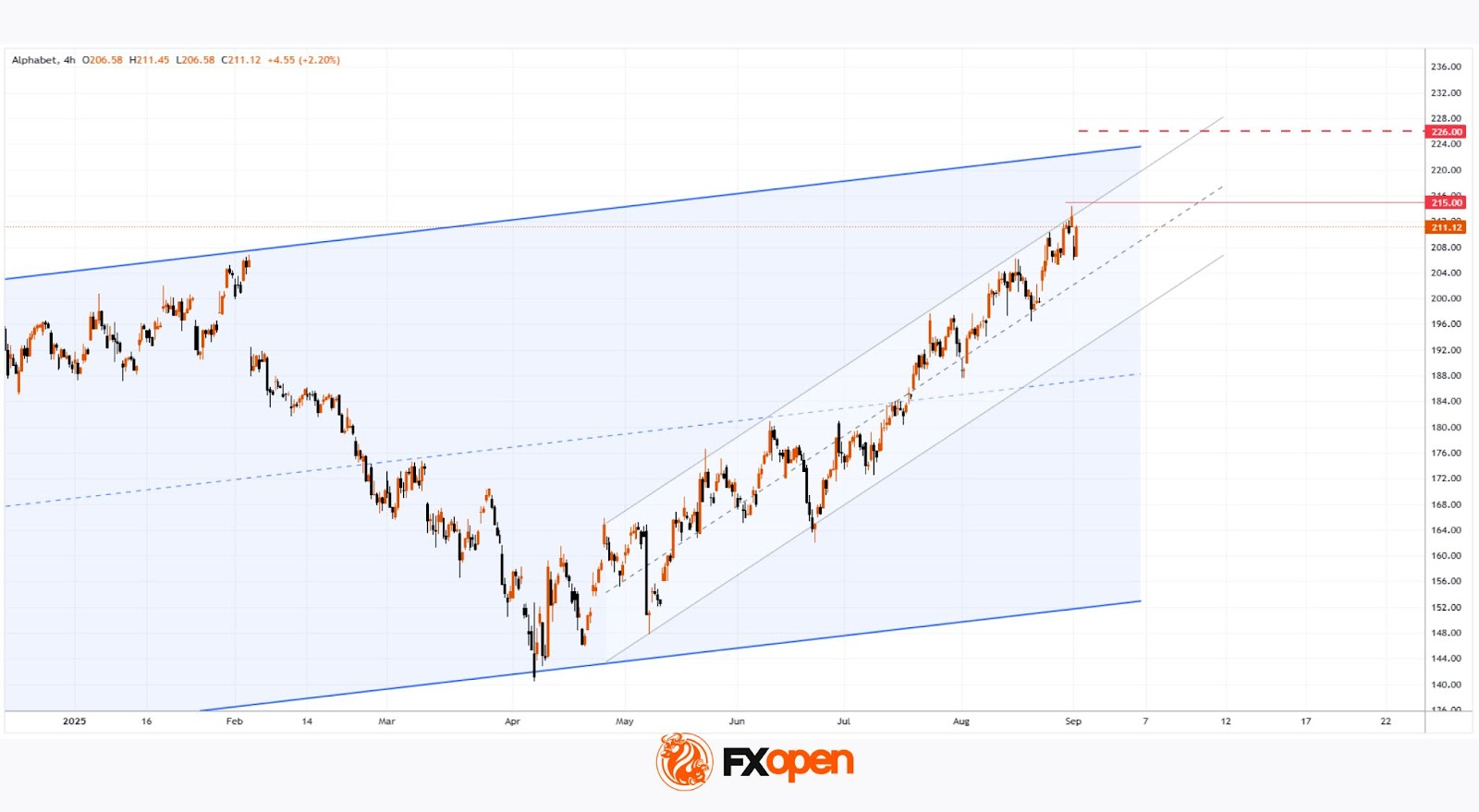 → в контексте динамики колебаний за летние месяцы, цена акции Alphabet (GOOGL) будет находиться в зоне экстремальной перекупленности.