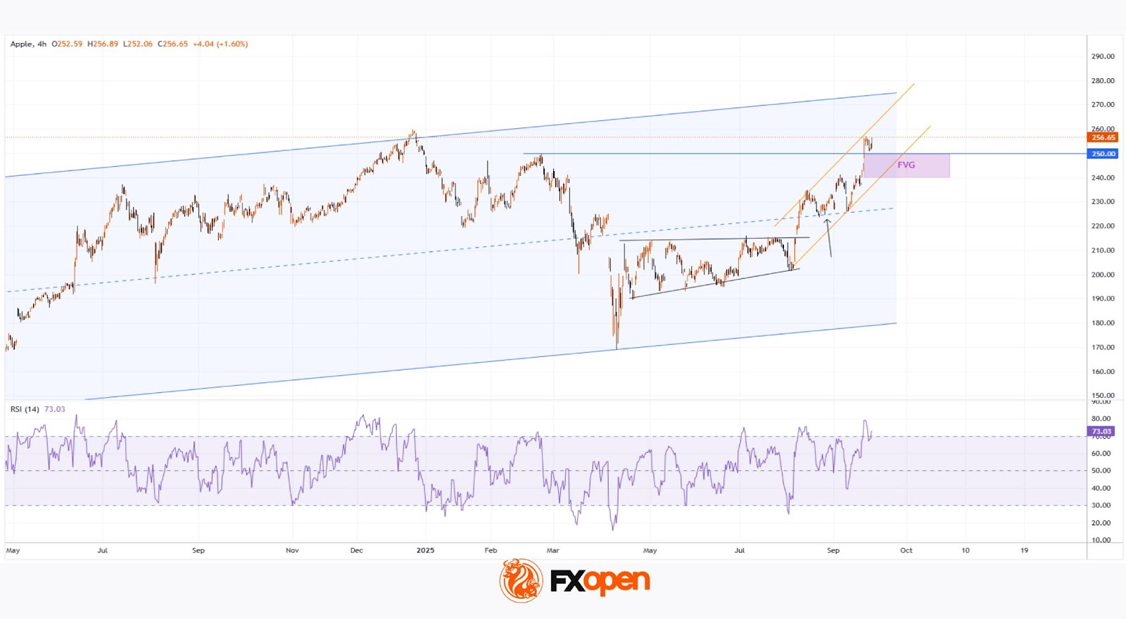 Тем не менее нельзя исключать, что рост цены акции AAPL продолжится на ожиданиях того, что высокий спрос на iPhone 17, а также на обновленные Apple Watch Series 11 и AirPods Pro 3 с новыми ИИ-функциями будут способны обеспечить компании рекордную выручку за квартал, включающий приближающийся праздничный сезон. В этом случае целью для быков может стать верхняя граница синего канала.
