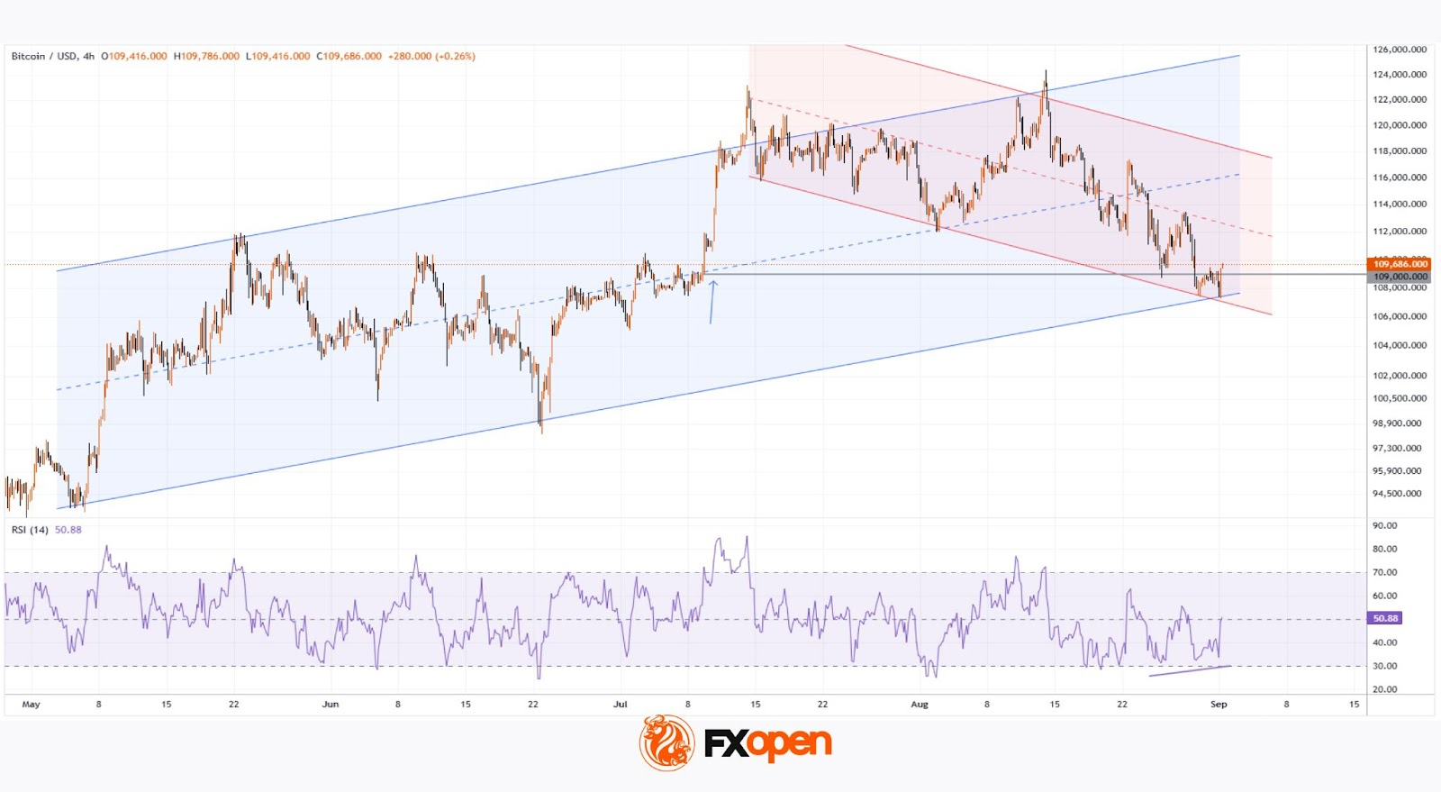 Учитывая, что индикатор RSI формирует серию бычьих дивергенций, а нижняя граница синего канала усиливается бычьим поведением цены около уровня $109k – Биткоин мог бы удерживаться внутри многомесячного синего канала. При этом ближайшей целью может стать восстановление к медиане красного канала.