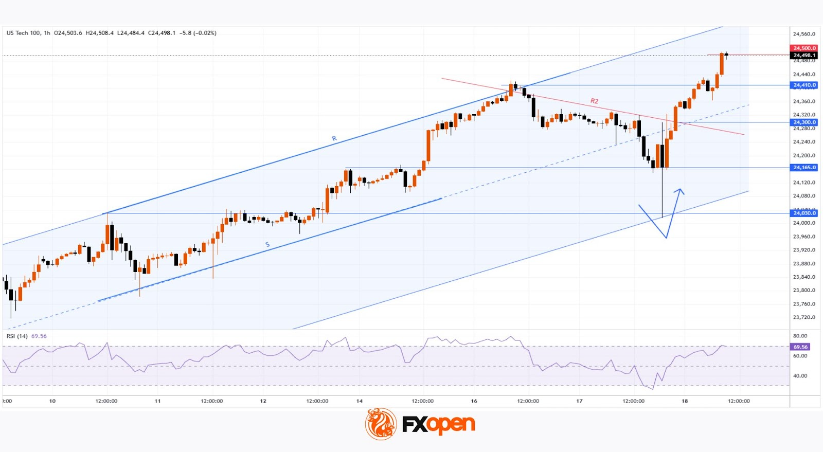 Как свидетельствует график, сегодня индекс Nasdaq 100 (US Tech 100 mini на FXOpen) впервые в истории поднялся выше уровня 24 500.