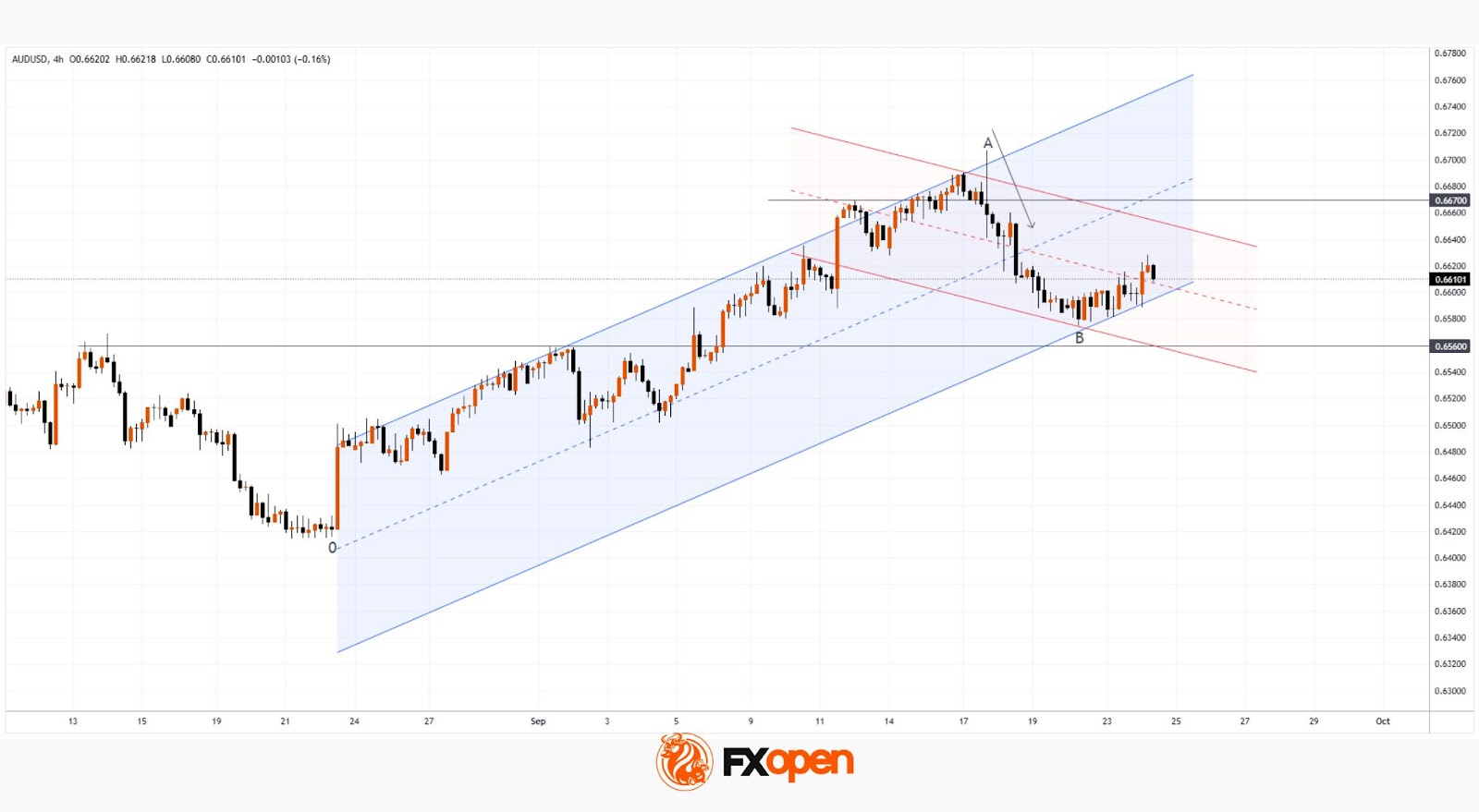Колебания курса AUD/USD с конца прошлого месяца формируют восходящий канал (показан синим цветом).