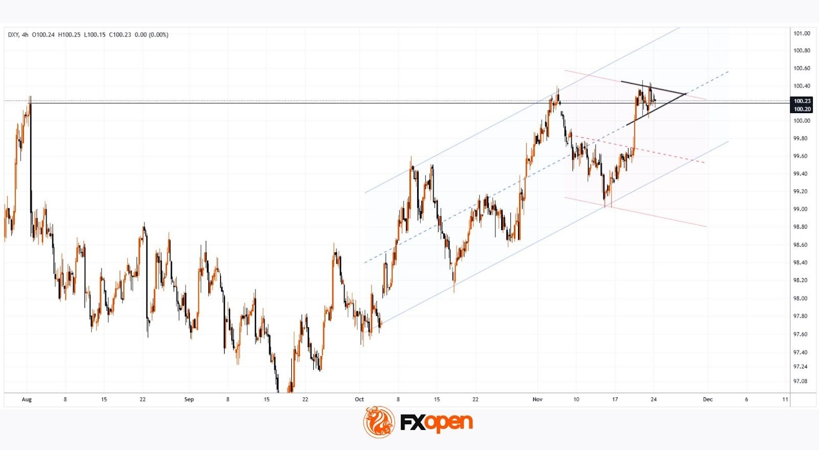 Как свидетельствует график индекса доллара (DXY), сегодня значение находится около важного сопротивления в районе 100.20 пунктов. Мы обращали внимание на него ранее – в том числе в аналитическом посте от 10 ноября.
