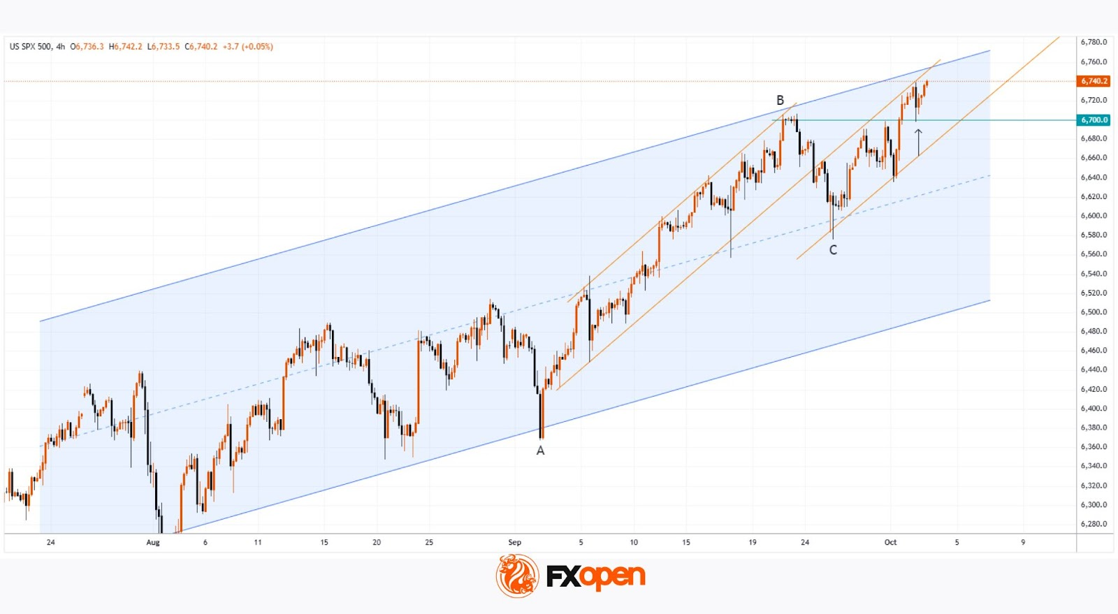 Сегодня индекс S&P 500 (US SPX 500 mini на FXOpen) поднялся до нового исторического максимума: утром в пятницу цена поднялась выше 6 740 пунктов. Это подтверждает сохраняющийся оптимизм участников рынка. Сегодня ему способствует новостной фон, связанный с создателями ChatGPT.