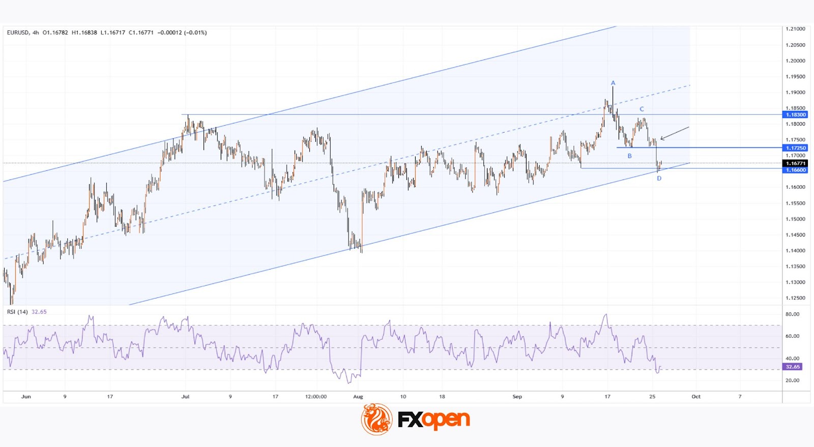 Колебания курса EUR/USD за последние несколько месяцев сформировали восходящий канал (показан синим цветом), который задаёт важный контекст для интерпретации ценовой динамики.