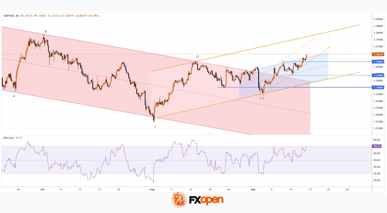 С того времени ситуация значительно изменилась: медведи не смогли закрепиться под уровнем 1.3400, и после формирования бычьего паттерна "Двойное дно" (1-2), цена устремилась вверх.