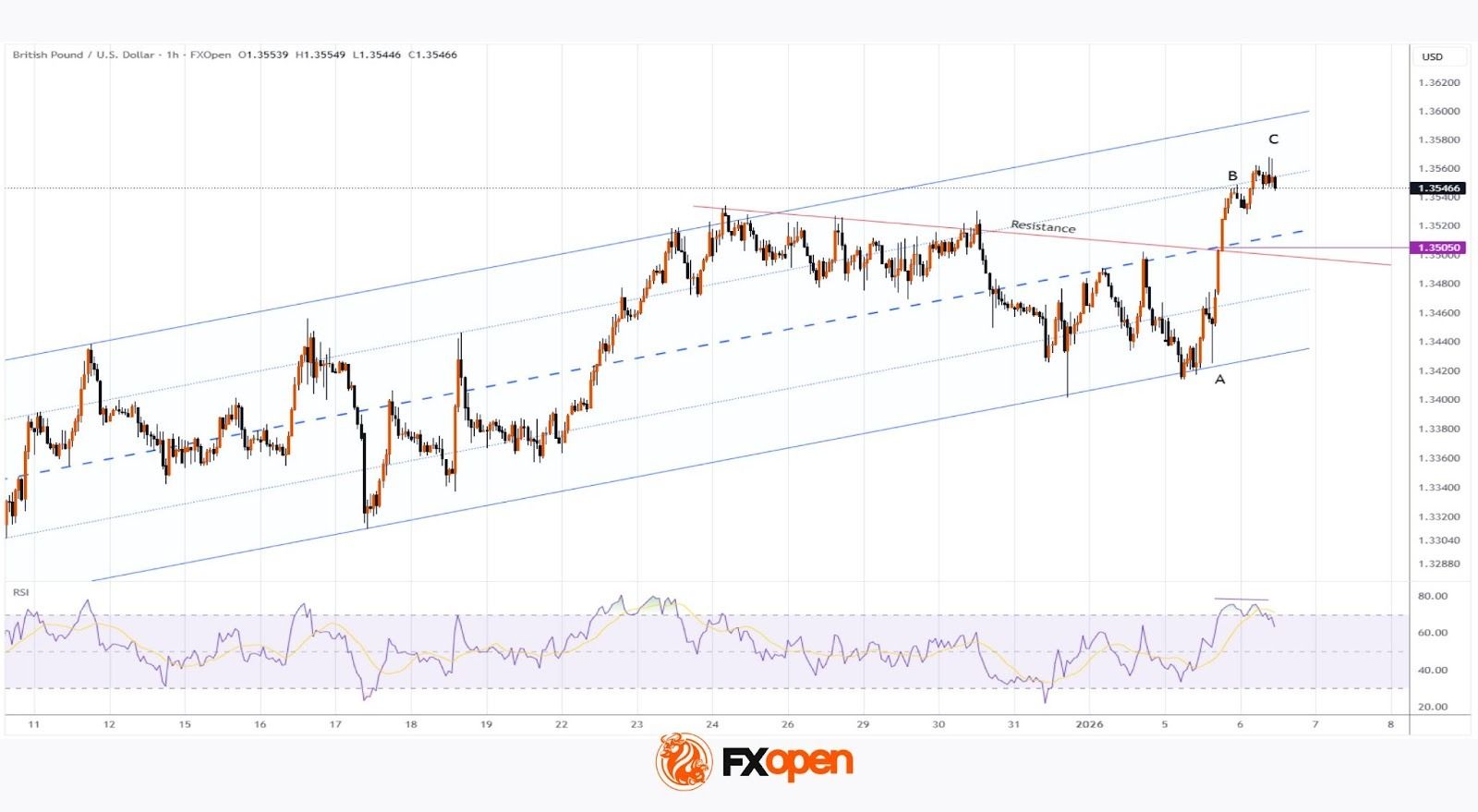 Однако стоит обратить внимание на RSI: между вершинами В и С наблюдается медвежья дивергенция, что можно интерпретировать как истощение роста. Исходя из этого, рынок может оказаться уязвимым для коррекции. В таком сценарии не исключено снижение курса GBP/USD к уровню 1.3505, который может выступить поддержкой, учитывая силу быков на этом уровне при пробое линии сопротивления и медианы канала.