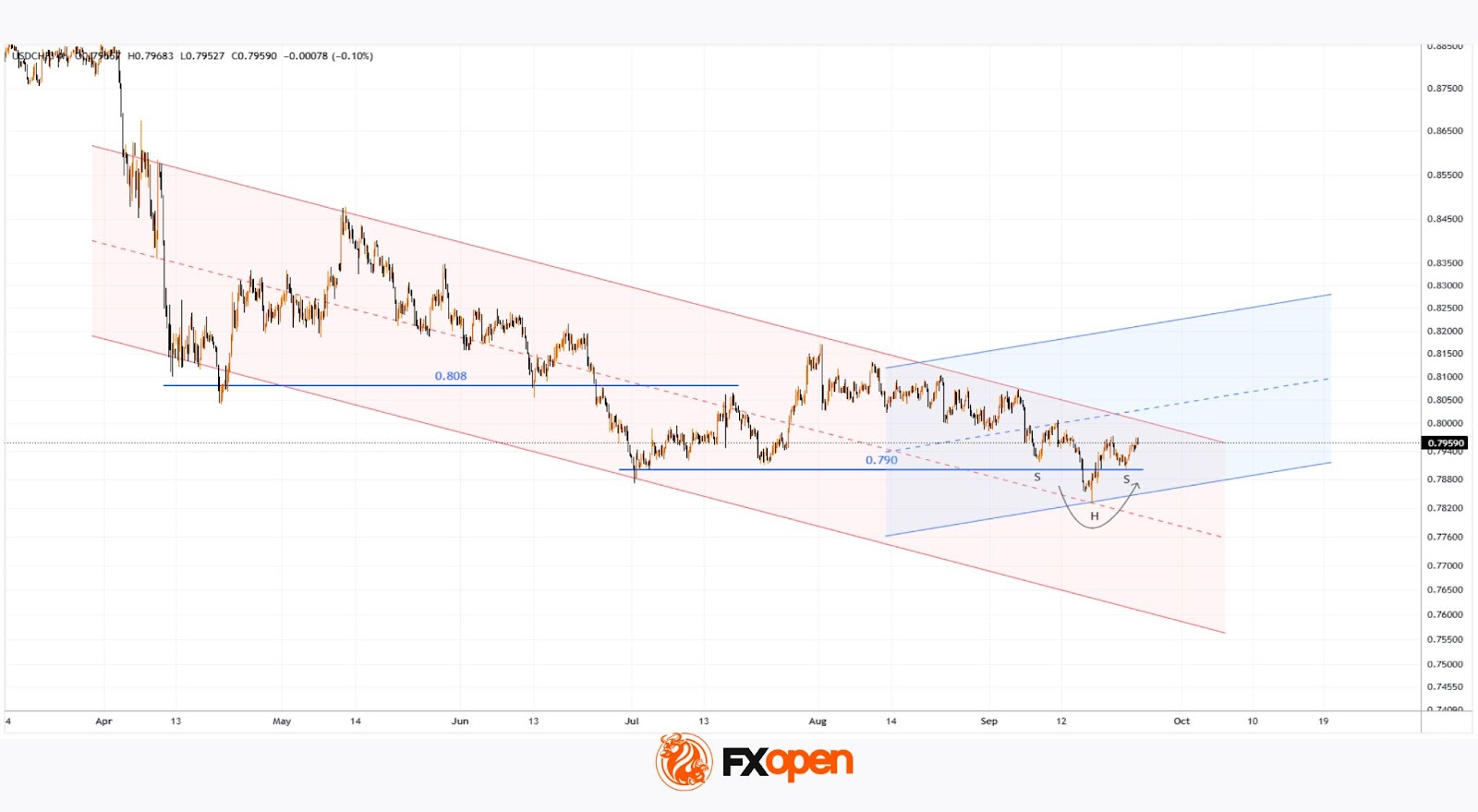 → Попытка медвежьего пробоя не увенчалась успехом. После краткосрочного падения ниже 0.7900 цена уверенно вернулась выше этого уровня.