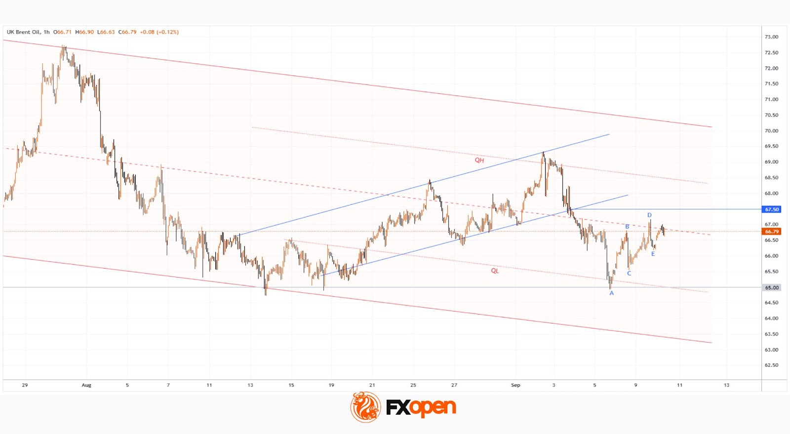 После всплеска экстремальной волатильности в конце июля колебания цены на нефть Brent формируют нисходящий канал (показан красным цветом), при этом: