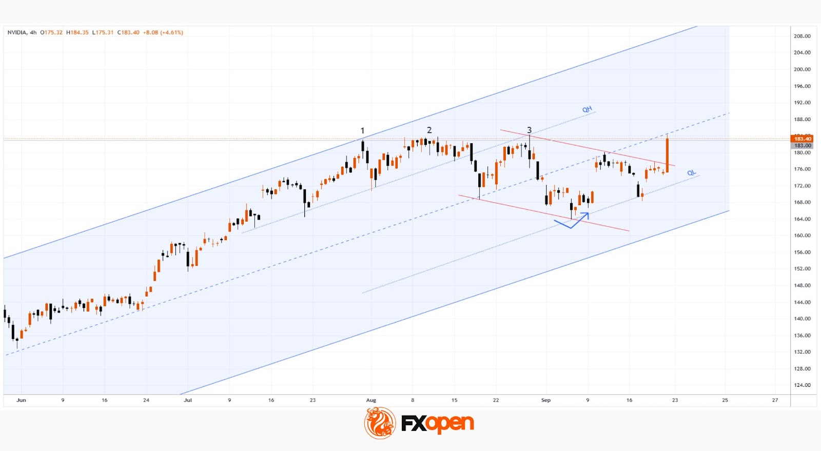 Не исключено, что сильный фундаментальный фон, развитие ИИ технологий и стимулирующий драйвер в виде снижения ставки ФРС приведет к тому, что быкам все-таки удастся сломить уровень $183, чтобы направить цену акции NVDA к психологической отметке $200.