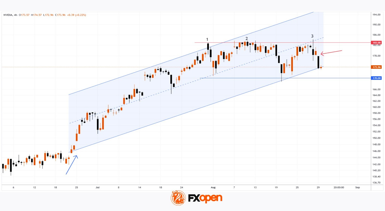 → построили восходящий канал (показан синим цветом), который описывает колебания цены акции NVDA после бычьего импульса в конце июня;