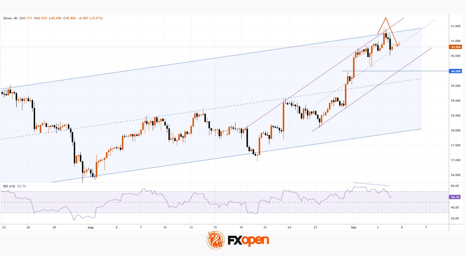 В этом контексте очевидно, что цена серебра столкнулась с блоком сопротивлений, который образуют верхние границы упомянутых каналов. Это может означать, что, с точки зрения краткосрочных и среднесрочных трейдеров, котировка XAG/USD может считаться завышенной → что приведет к активизации потока продаж (фиксация прибыли от лонгов и открытие позиций шорт).