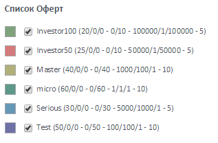 Показатели оферт несложно расшифровать (расшифровка также видна при наведении курсора мыши на оферту). Предлагаю разобрать на примере самые важные показатели по оферте Микро: 60%- это вознаграждение управляющего, 60 % – штраф при досрочном выводе со счета средств, 1 доллар – минимальный депозит входа в ПАММ-счет, 1 доллар – минимальная сумма пополнения счета, 1 доллар – минимум средств, которые должны находиться на счете весь торговый период, 10% – комиссия агента. В оферте номер 4 и 5 имеется процент, который выплачивается агенту за привлечение крупного инвестора.