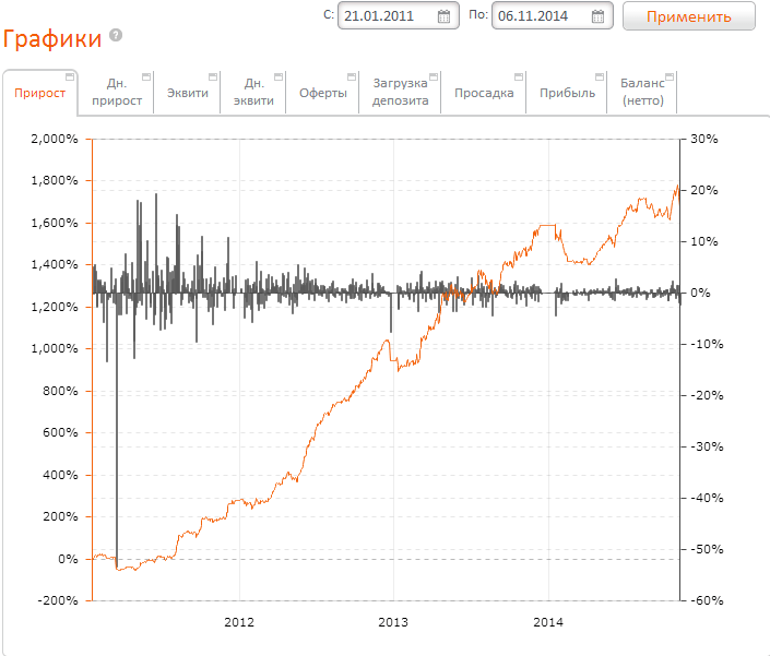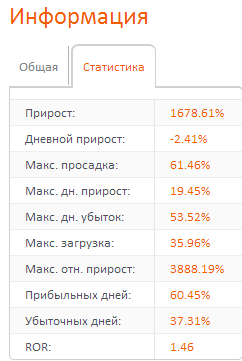 На момент анализа данный счет заработал уже 1678.61% прибыли. Основное правило для этого проекта – жесткое ограничение убытков. Максимальная просадка была внушительной, но только в самом начале открытия ПАММ-счета, когда не была отлажена вся система работы, на тот момент она составляла 61,46%, но за все время работы счета максимальная загрузка депозита не превысила 35,96%. Всего за неполных три года открыто 16770 позиций и отработано 474232 пунктов.