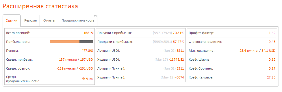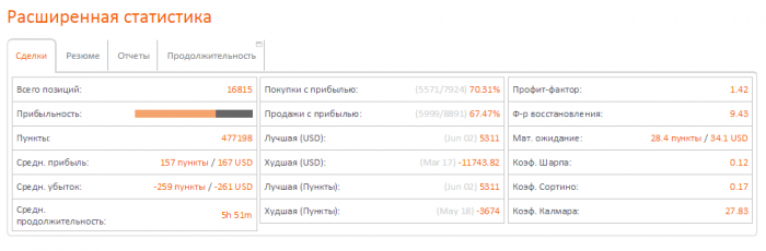 Обычные статистические показатели практически совершенны: профит фактор по счету – 1,42, коэффициент Калмара 27,31 (!) и фактор восстановления – 9,31. Трудно найти более стабильные показатели, что, впрочем, демонстрирует стабильную прибыльную работу ПАММ Trade-Bowl.