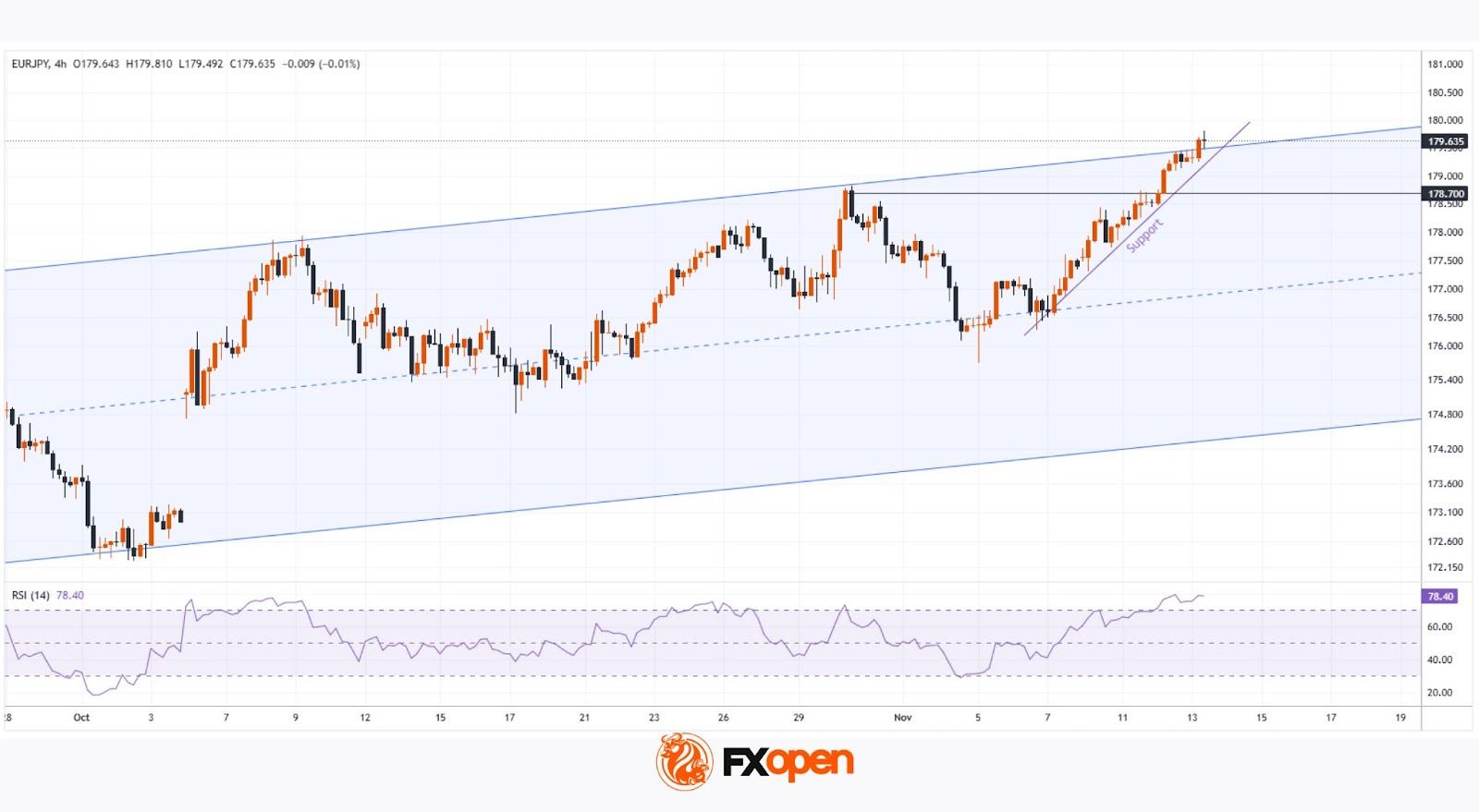 Колебания цены формируют восходящий канал (показан синим цветом). После того как в начале октября стало известно о победе Санаэ Такаити, которая считается последовательницей экономических стимулов, иена ослабла – курс EUR/JPY поднялся в верхнюю половину канала.