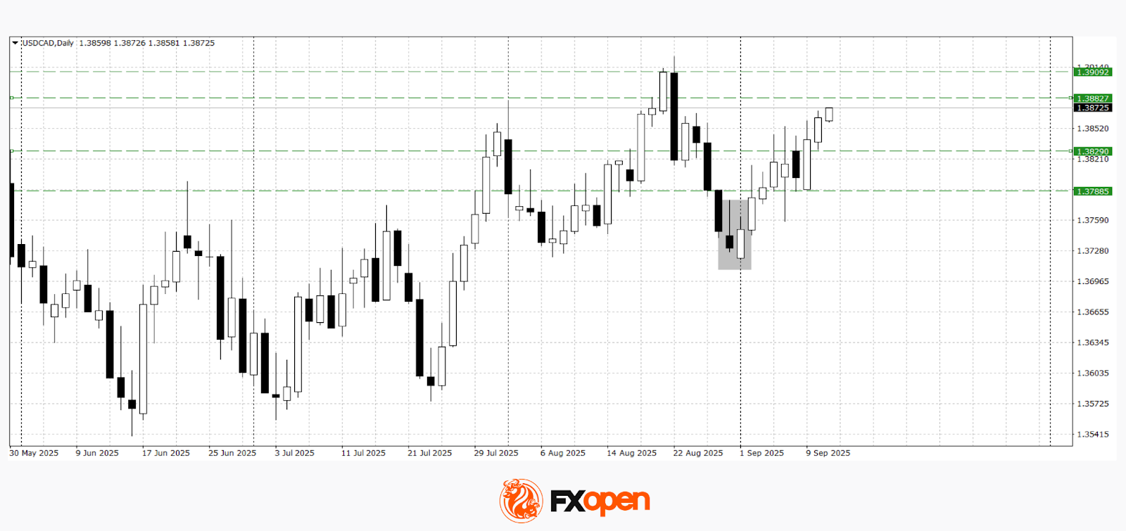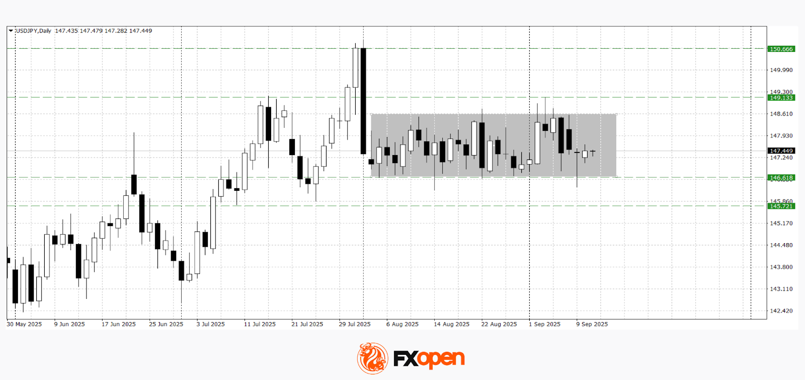 Доллар США демонстрирует осторожную динамику: пара USD/JPY удерживается в диапазоне, отражая выжидательную позицию участников рынка, тогда как USD/CAD постепенно приближается к максимумам августа. Такая разница в поведении подчеркивает, что инвесторы осторожно распределяют позиции на фоне неопределенности в отношении дальнейших шагов Федеральной резервной системы.