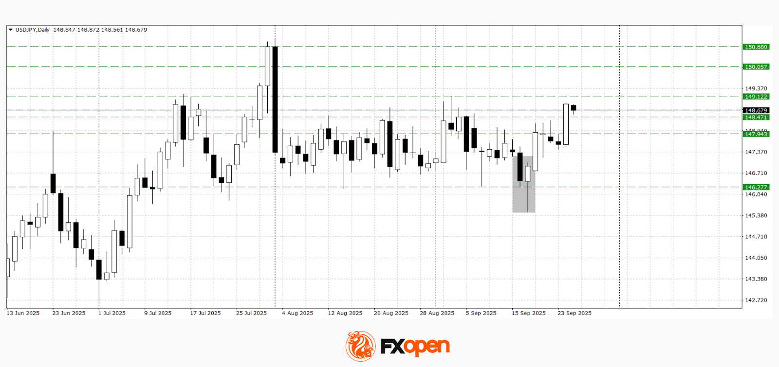 После ложного пробоя важной поддержки на уровне 146.30 на прошлой неделе покупателям USD/JPY удалось сформировать разворотную комбинацию “пронизывающая свеча”. Реализация этой формации способствовала подъёму котировок к верхней границе среднесрочного диапазона 146.30–149.00. Технический анализ USD/JPY указывает на вероятность возвращения цены внутрь данного коридора, если в ближайшие торговые сессии не произойдёт закрытия дневной свечи выше уровня 149.00.