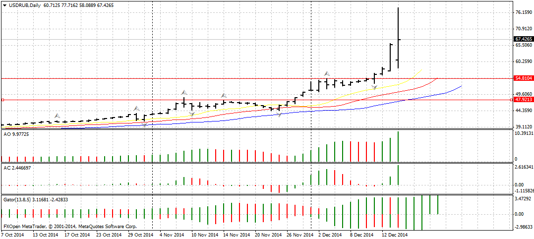 Подытожив, можно сказать, что пара вполне может подойти к психологическим отметкам 90.00-100.00. Но при покупках следует помнить о возможных крупных интервенциях от Центробанка, которые вполне могут опустить цену к 50.00-40.00. О нисходящей коррекции можно будет говорить не раньше середины января.
