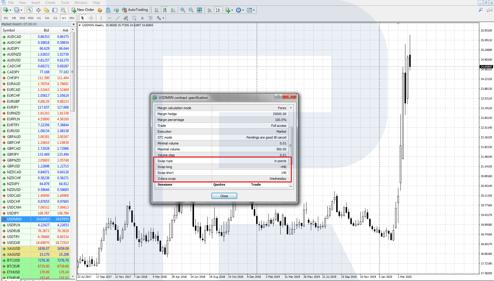 Если коротко, то своп (от английского swap — “обмен”) — это сделка, закрытие которой переносится на следующие 24 часа. В этому случае с итоговой суммы списывается дополнительная комиссия, которую в форекс платформе MetaTrader можно увидеть во вкладке “Specifications” к каждой валютной паре.