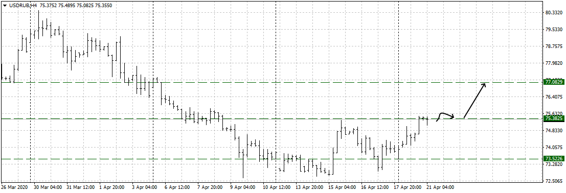 Российская валюта также несет потери в связи с обвалом нефтяных котировок. На прошлой неделе пара протестировала 73 фигуру и имела все шансы на продолжение нисходящей коррекции. Но вчерашний импульсный рост пары спутал все карты покупателям рубля. Цена успешно протестировала отметку 75.00, и если ситуация на нефтяном рынке не стабилизируется, вполне вероятен еще один подход к диапазону 80.00-77.
