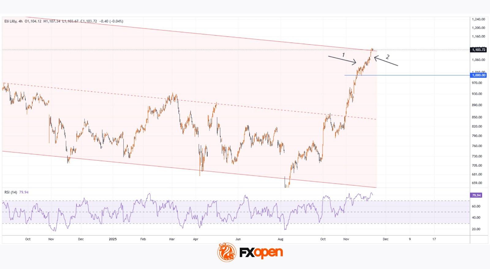 Обратите внимание, что после превышения психологической отметки $1000, рост замедлился (1), но на этой неделе резко ускорился (2) – это может быть признаком FOMO и кульминацией восходящего ноябрьского тренда.