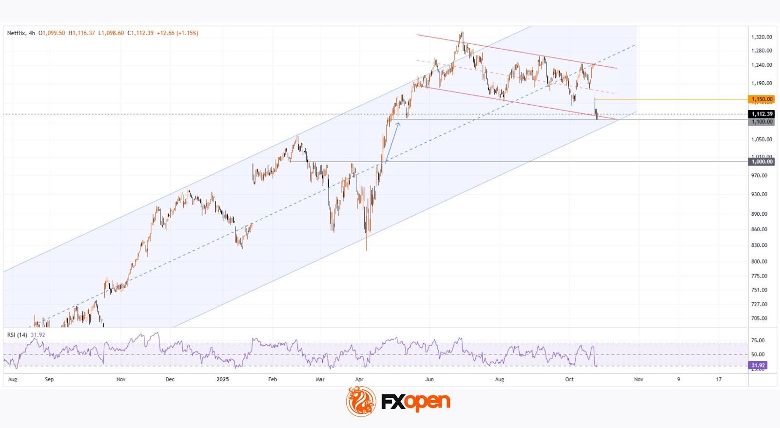 Как свидетельствуют графики, стоимость акции Netflix (NFLX) на этой неделе торговалась ниже $1100 – впервые с конца мая. Снижение с июльского максимума превысило 17%, для сравнения – индекс S&P 500 (US SPX 500 mini на FXOpen) находится сегодня в районе исторических пиков.
