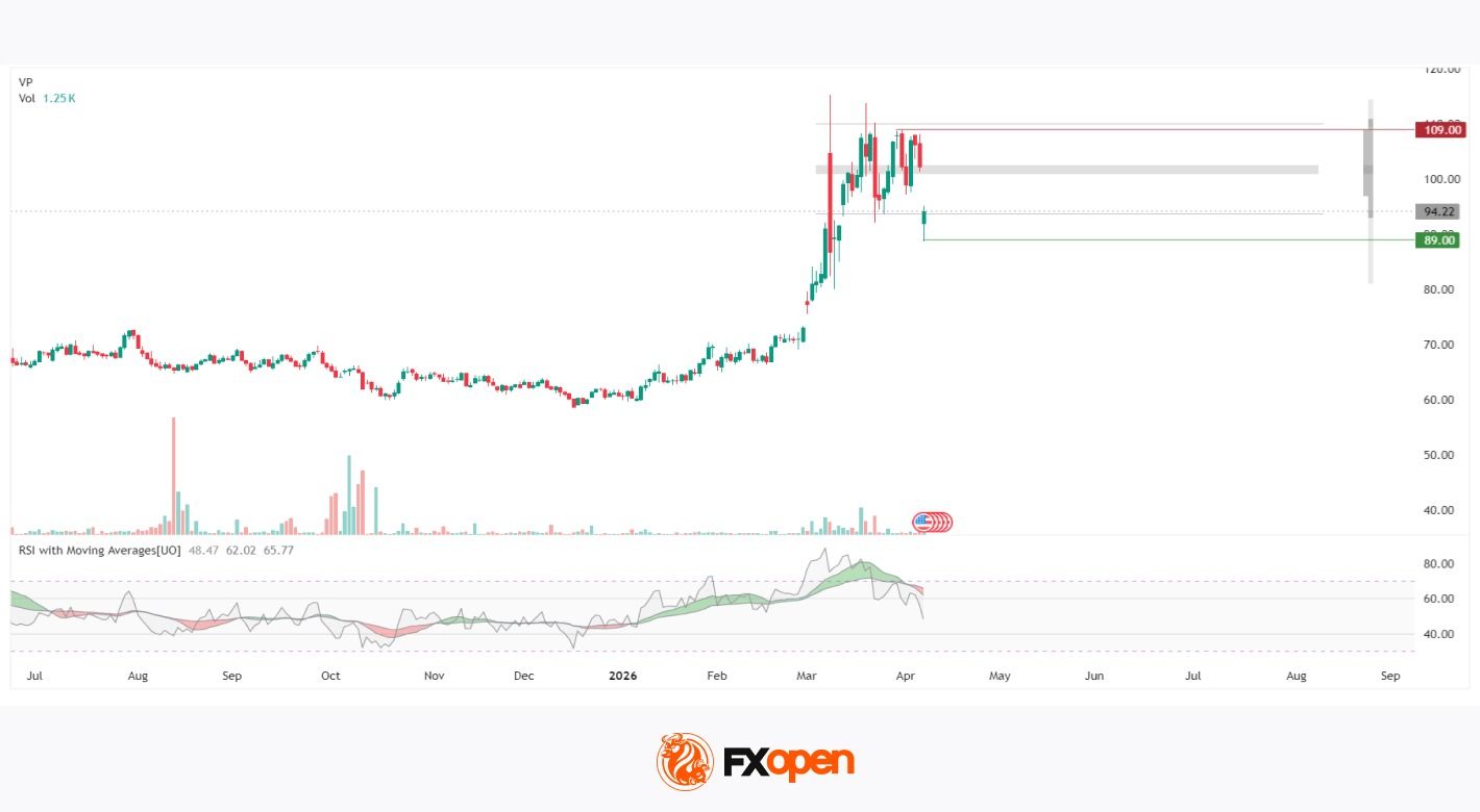 Котировки Brent резко скорректировались после снятия геополитической премии и давления со стороны роста предложения от ОПЕК+. Технически цена находится ниже зоны POC при медвежьем контексте индикатора RSI+MA, а ключевые ориентиры диапазона — 89 и 109 — сохраняют актуальность на ближайшей сессии.