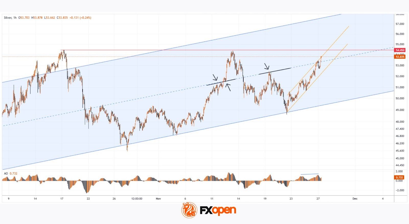 Анализируя график XAG/USD, мы определяем ключевые развороты, чтобы построить восходящий канал. При этом наблюдаемый на этой неделе рост привел к тому, что цена серебра переходит в верхнюю половину канала.