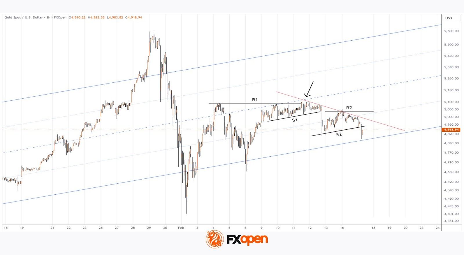 Действительно, с 9 до 12 февраля рынок сформировал зону консолидации чуть выше уровня $5k, а если точнее – между сопротивлением R1 и локальной поддержкой S1.