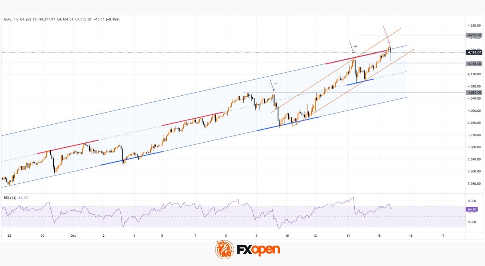 Как свидетельствует график, котировка XAU/USD впервые поднялась над уровнем $4200. Восходящую динамику поддерживают продолжающийся шатдаун правительства США, спрос со стороны центральных банков (по данным СМИ, резко увеличил запасы ЦБ Индии). Кроме этого внимание трейдеров направлено на события, связанные с торговыми отношениями Китая и США.