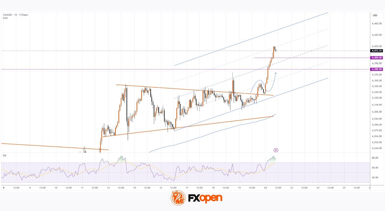 Как свидетельствует график XAU/USD, сегодня цена золота поднялась выше $4400, что является новым историческим рекордом.