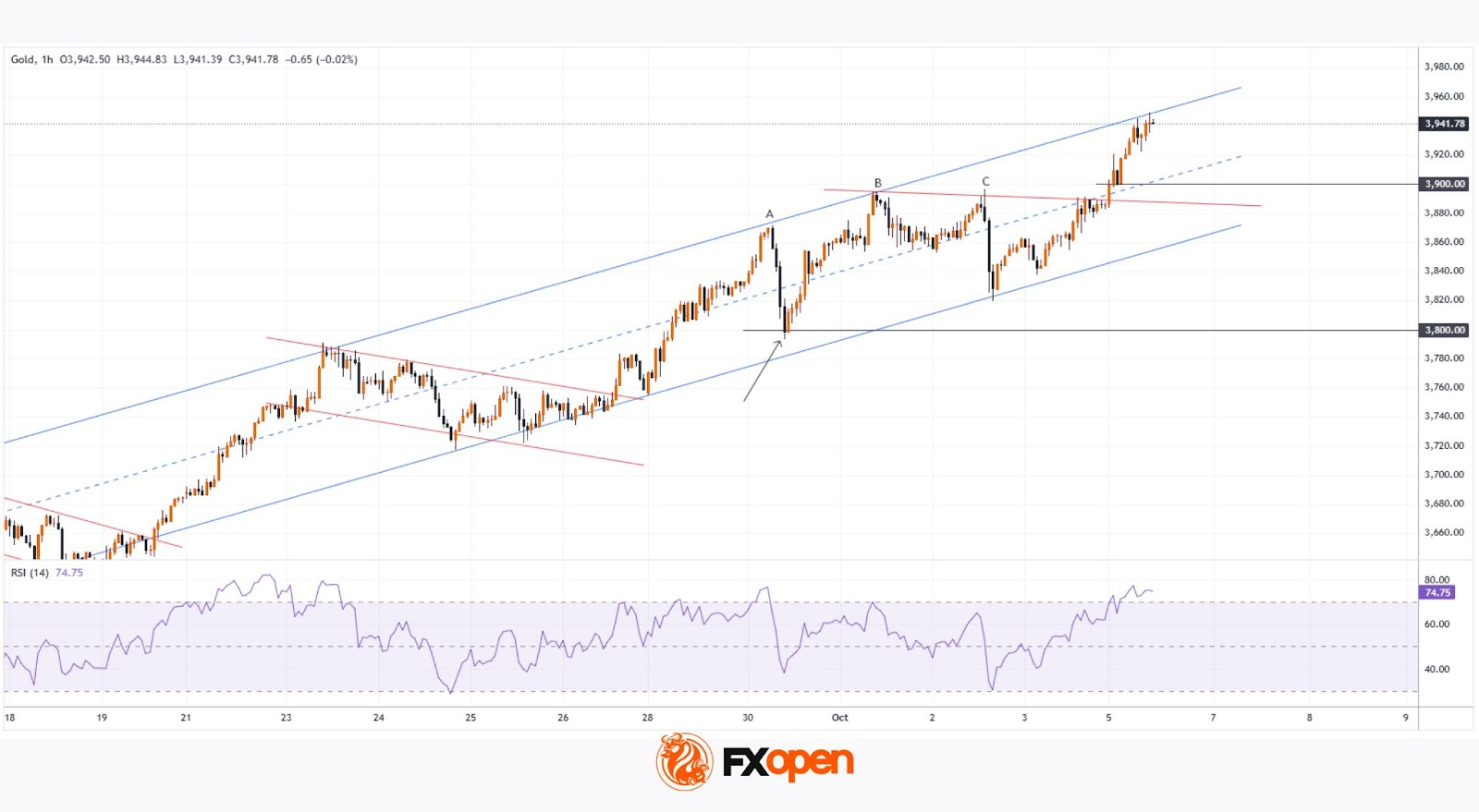 Если баланс настроений не будет меняться кардинально, не исключено, что попытка быков штурмовать психологическую отметку $3950 приведет к более уязвимому положению для формирования отката на графике XAU/USD – в таком случае ближайшей целью продавцов может послужить медиана текущего канала.
