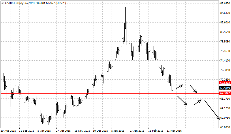 Российский рубль сполна воспользовался представившейся возможностью для укрепления. Благодаря стабилизации на рынке нефти и ослабшему доллару пара оказалась у 68 фигуры. На данный момент наблюдаем закономерную коррекцию после столь сильного падения. Первыми отметками, где может возобновиться нисходящее движение, выступают 69.20-69.50.