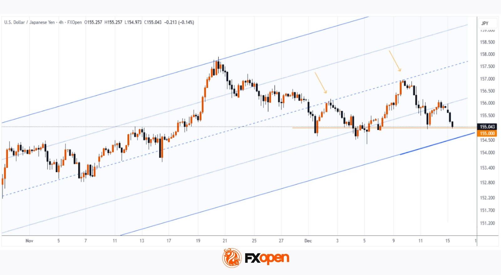 Учитывая сказанное выше, допустимо предположить, что рыночные настроения, связанные с ожиданиями ужесточения денежно-кредитной политики, могут привести к тому, что блок поддержек от нижней границы канала и ключевого уровня 155.00 будет пробит и сменит роль на сопротивление, а курс USD/JPY откроет себе дорогу к ключевой поддержке 150 иен за доллар.
