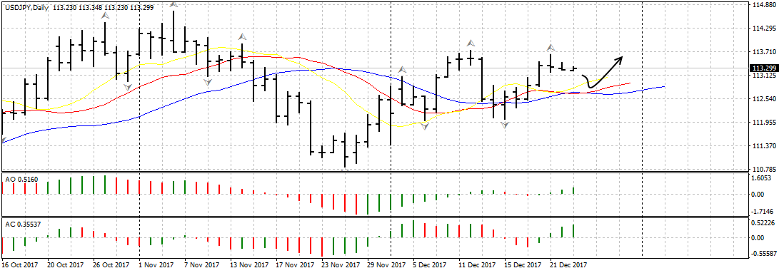 Восходящее движение пары usd/jpy прервалось у довольно важных отметок. Диапазон 114.00-113.70 в очередной раз подтвердил свою важность, и 21 декабря был сформирован разворотный бар на продажу с точкой входа у 113.20. Пока усилия продавцов безрезультатны, но вполне вероятно увидеть в ближайшие дни тест 112.00-111.70. А вот поведение цены у данного диапазона даст больше подсказок по дальнейшему движению пары.