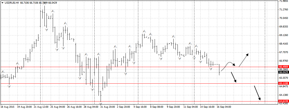 В итоге таких новостей нефть (WTI), после безуспешной попытки пробить поддержку на 43.50, устремилась к тесту диапазона 47.00-48.00. Если она сможет туда добраться, рубль соответственно протестирует 65.00-63.00. Этот сценарий возможен при условии, что не будет особых сюрпризов от ФРС, которые могли бы спровоцировать взлет доллара к отметкам 68-70.