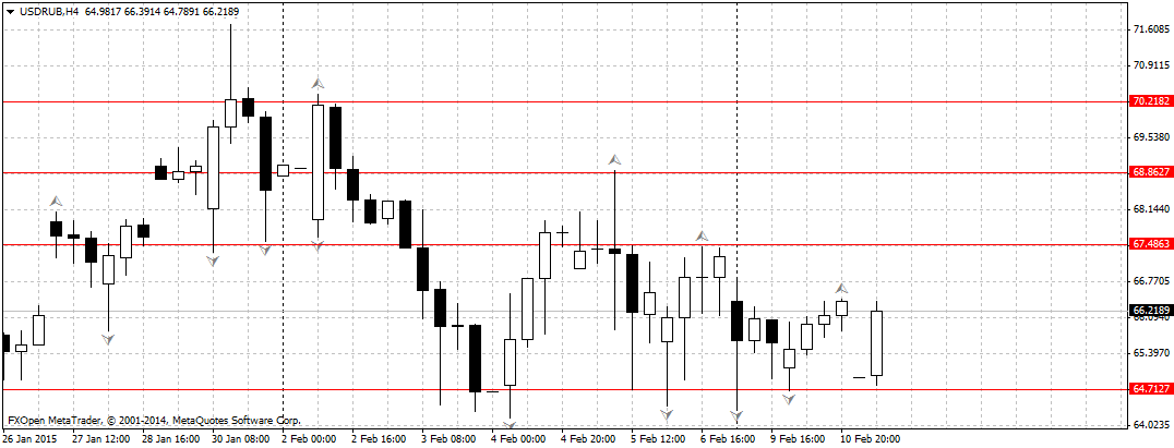 Небольшая передышка, которую предоставил российскому рублю скачок цен на нефть, использовалась для консолидации у диапазона 64.70-65.30. Вчера «черное золото» не сумело развить восходящее движение и откатило вниз от значимых уровней сопротивления. Утром рубль отреагировал на это ростом к отметке 66.70.