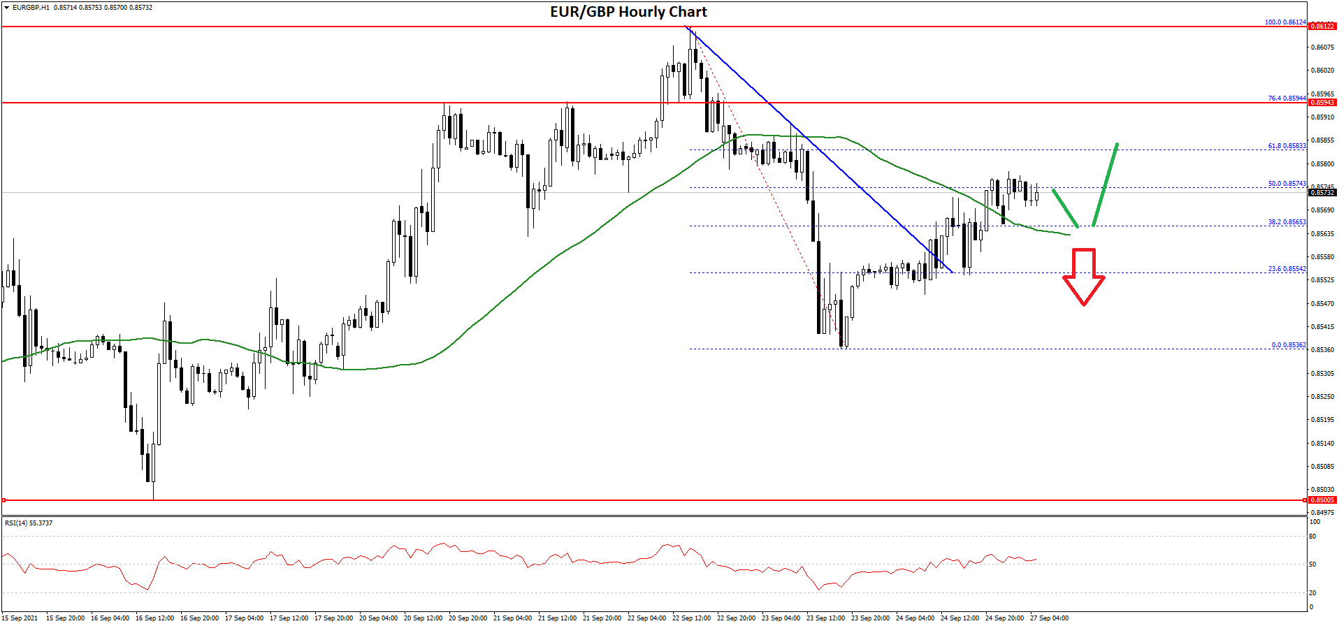 Besides, there was a break above a major bearish trend line with resistance near 0.8565 on the hourly chart. The pair is back above the 0.8565 level and the 50 hourly simple moving average. It is trading near the 50% Fib retracement level of the downward move from the 0.8612 high to 0.8536 low.