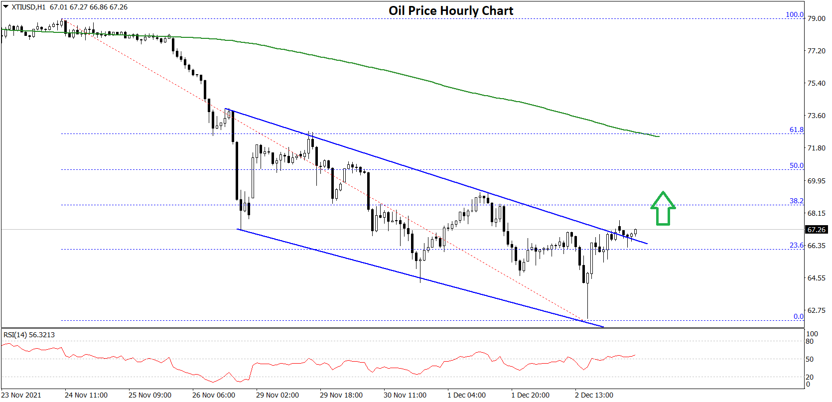 Besides, there was a break above a major declining channel with resistance near $66.50 on the hourly chart of XTI/USD. The price is now facing resistance near the $68.00 level. The next key resistance is near the $70.00 level.