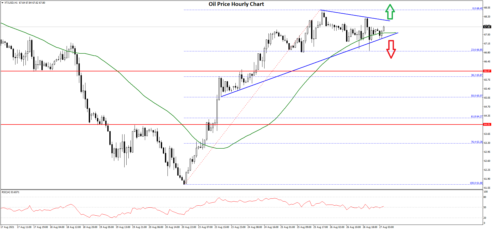 · There is a major contracting triangle forming with resistance near $68.00 on the hourly chart of XTI/USD.