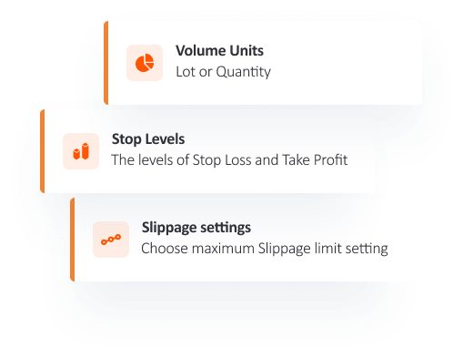 Slippage settings: Allows to choose maximum Slippage limit setting measurement for market and stop orders. In Points or in percent of the market price.