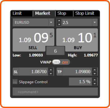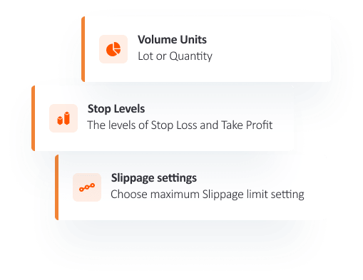 Slippage settings: Allows to choose maximum Slippage limit setting measurement for market and stop orders. In Points or in percent of the market price.