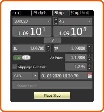 GTD – Good Till Date. Pending Stop order with specified validity date. After specified time the order is deleted if the Limit price was not reached and the order hasn’t been activated. Margin is locked for this type of order.